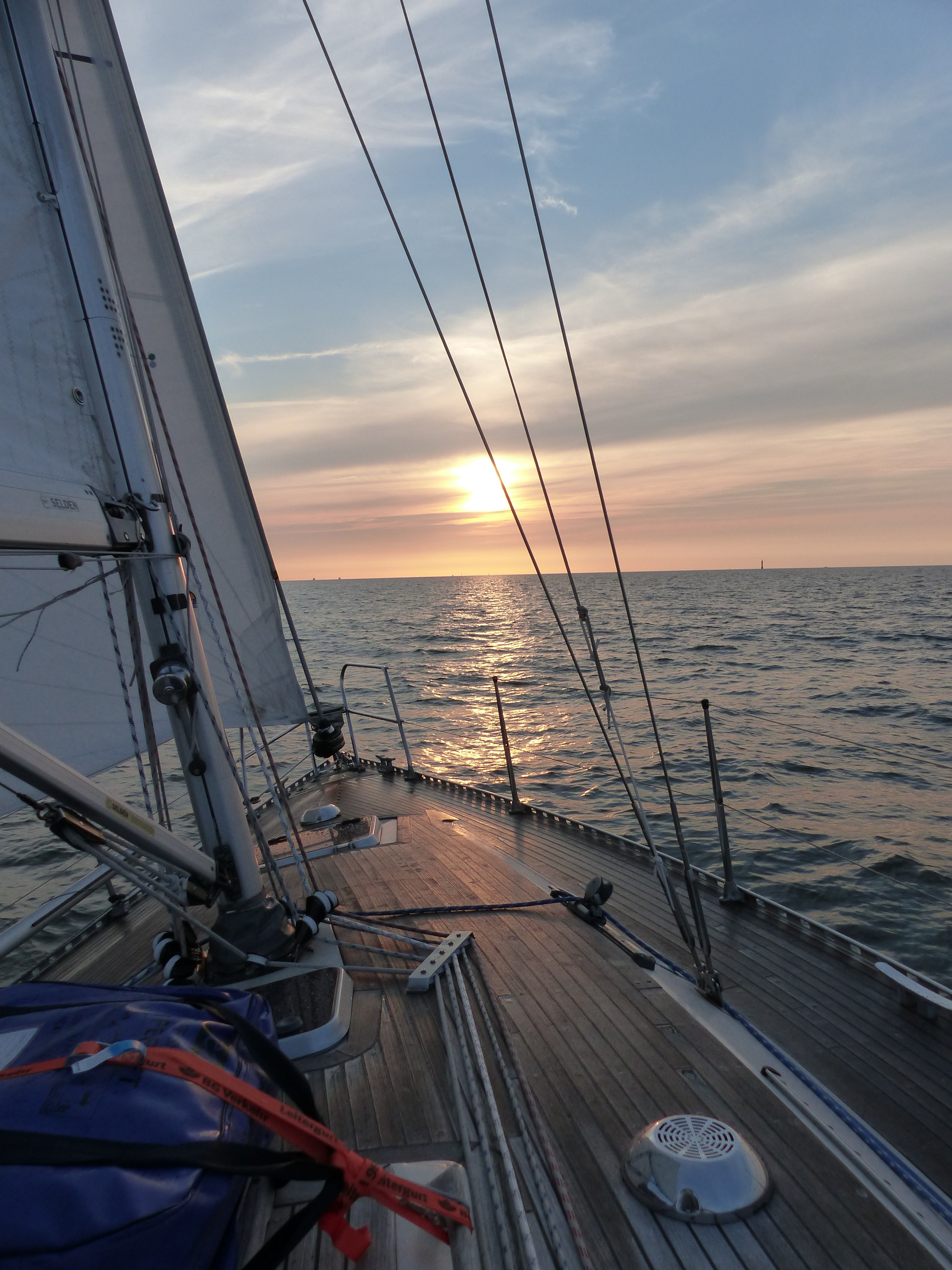 Ausgeschlafen, Sonne weckt uns, gut gefrühstückt. Nach einigem Gerödel, u.a. wird die Genua 1 angeschlagen, um 14:15 h, etwa 2 Std. vor Hochwasser Glückstadt, Leinen los mit Ziel Helgoland. Die Fahrt unter Segel und teilweise Motor ist nicht langweilig, unsteter Wind nach Richtung und Stärke. Gegen 19:00 h passieren wir die Kugelbake in Cuxhaven und verlassen damit die Unterelbe.